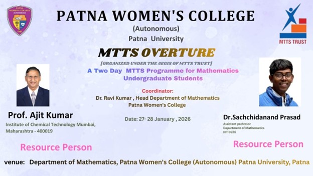 The Department of Mathematics, Patna Women’s College (Autonomous), Patna University has organized two days MTTS OVERTURE from 27th January 2026 to 28th January 2026. The resource persons for this event are Prof. Ajit Kumar, Dept of Mathematics, ICT, Mumbai and Dr. Sachchidanand Prasad, Assistant Professor, Department of Mathematics, IIIT Delhi. Read More…