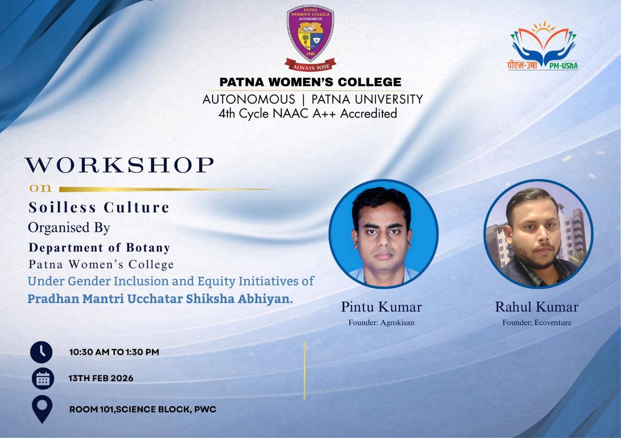 The Department of Botany at Patna Women’s College (Autonomous) organized a workshop on “Soilless Culture” under the Gender Inclusion and Equity Initiatives of Pradhan Mantri Ucchatar Shiksha Abhiyan for Botany students. The resource persons, Mr. Pintu Kumar, Founder of Agrokisan, and Mr. Rahul Kumar, Founder of Ecoventure, shared valuable insights Read More…