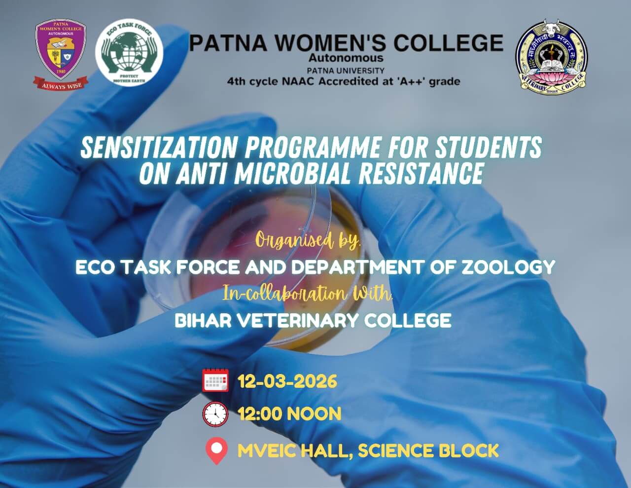 A sensitization program on Antimicrobial Resistance (AMR) was organized on March 12, 2026, in the MVEIC Hall of the Science Block of Patna Women’s College, Autonomous, Patna University. The program was jointly organized by the ECO Task Force and the Department of Zoology, Patna Women’s College in collaboration with Bihar Veterinary College, Patna.