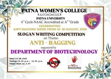 (12th-18th August,2025) The Department of Biotechnology, Patna Women’s College (Autonomous) observed Anti-Ragging Day on 12th August 2015, marking the beginning of Anti-Ragging Week (12-18th August), in line with the UGC guidelines and the Centre for Youth (C4Y), the UGC National Anti-Ragging Monitoring Agency. On Day 1(12th August), screening of documentaries was done. The documentaries were […]