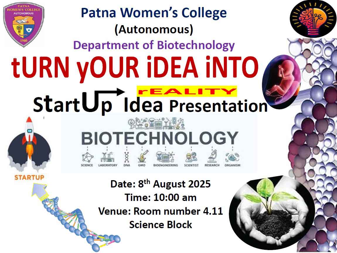 The Department of Biotechnology, Patna Women’s College, organized a Startup Ideas Presentation on August 8, 2025, showcasing the creativity and innovation of its students. The event was conducted under the supervision of Dr. Alok Ranjan, with valuable guidance from Dr. Arti Kumari, Head, Department of Biotechnology. Faculty members Dr. Vivek Raj and Dr. Premlata Kumari, […]