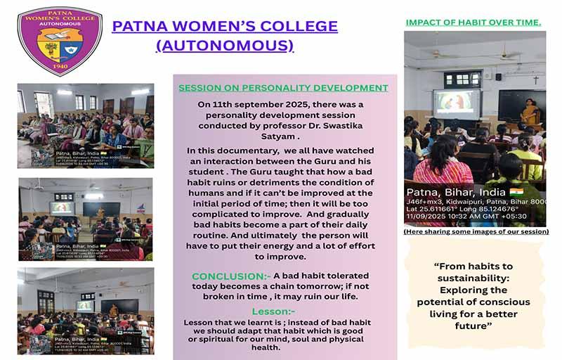 A personality development class was conducted by the Department of Economics, Patna Women’s College (Autonomous) on 11th September, 2025 in room no. 38 for the students of semester III. The session was conducted by Ms. Kamaljeet Kaur, Assistant Professor, Department of Economics. During the session, a short presentation was shown Read More…