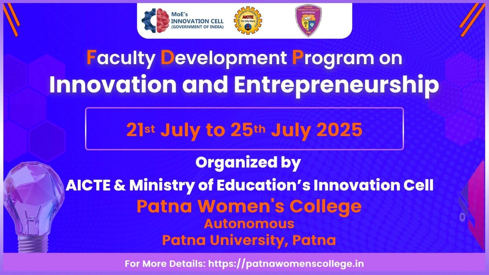 On July 25, 2025, Patna Women’s College (Autonomous) successfully concluded a five-day Faculty Development Programme (FDP) on Innovation & Entrepreneurship from 21st to 25th July 2025. Sponsored by the Ministry of Education’s Innovation Cell (MIC) and AICTE, the FDP aimed to equip faculty from BBA, BCA, MCA, and Management institutions with tools to build innovation […]
