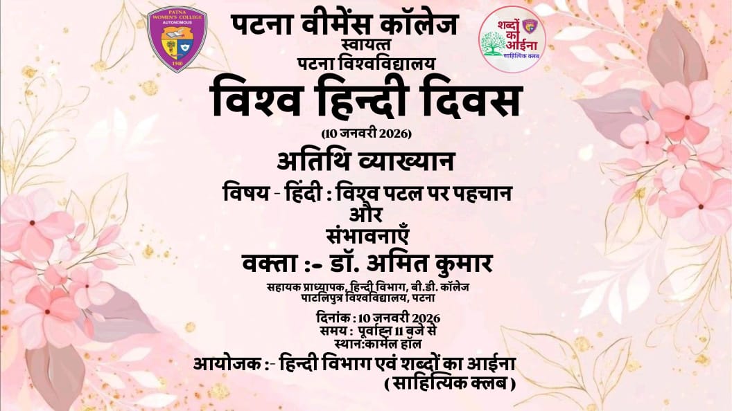दिनांक 10 जनवरी, 2026 कोविश्व हिंदी दिवस के अवसर पर पटना वीमेंस कॉलेज के हिंदी विभाग एवं शब्दों का आईना साहित्यिक क्लब द्वारा हिंदी :विश्व पटल पर पहचान एवं संभावनाएं विषय पर अतिथि व्याख्यान का आयोजन किया गया। कार्यक्रम के अतिथि वक्ता बीडी कॉलेज, पाटलिपुत्र विश्वविद्यालय,पटना के हिंदी विभाग के Read More…