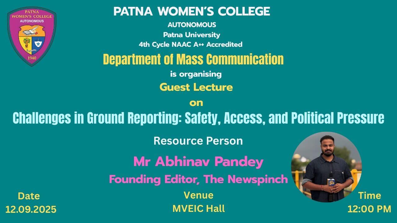 Department of Mass Communication Hosted Guest Lecture on ‘Challenges in Ground Reporting’ The Department of Mass Communication at Patna Women’s College, Autonomous organized an insightful guest lecture on the theme “Challenges in Ground Reporting: Safety, Access, and Political Pressure.” The session was held on Friday, September 12, 2025, from 12:00 PM onwards at the MVEIC […]
