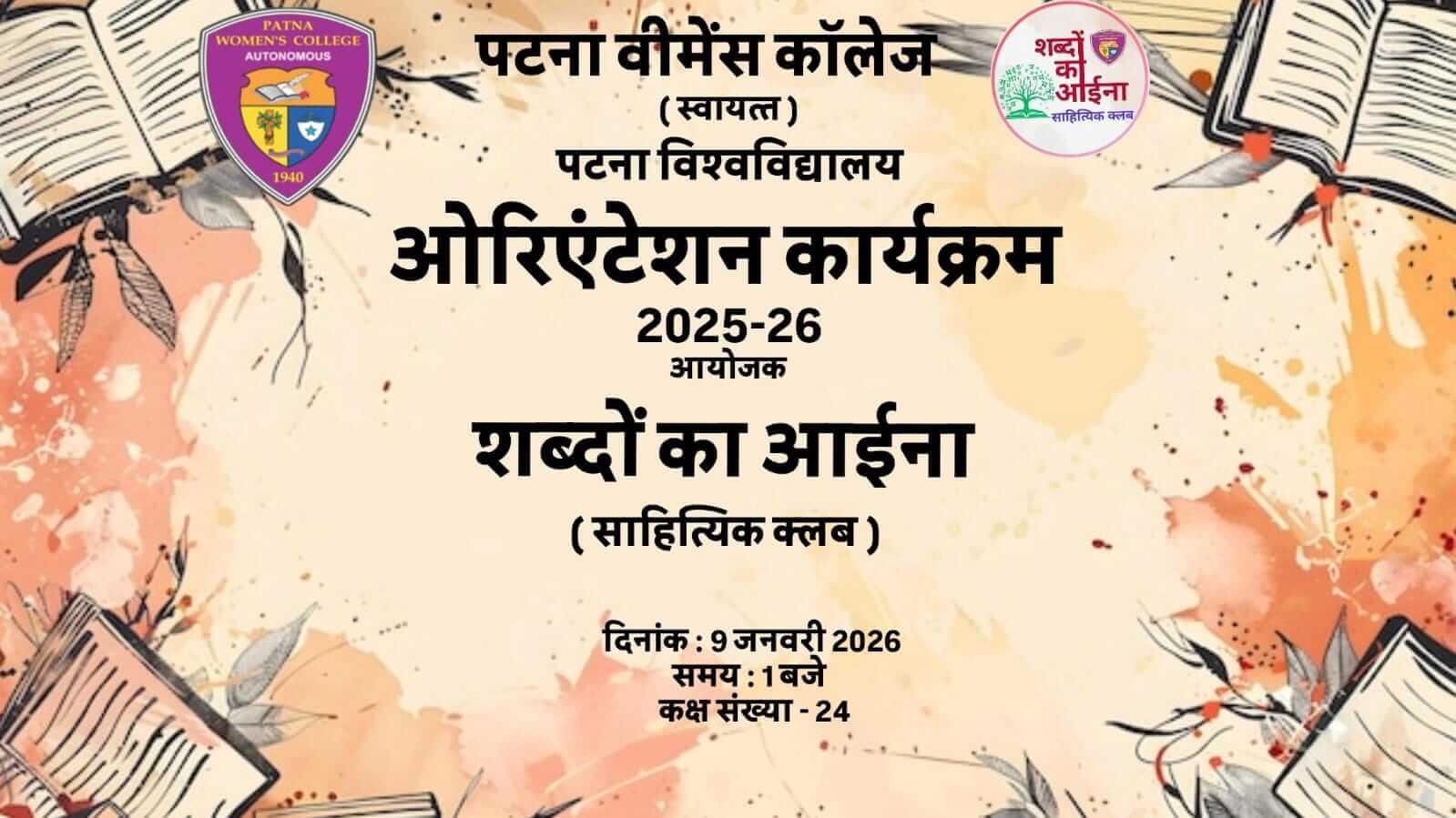 दिनांक 9 जनवरी, 2026 को पटना वीमेंस कॉलेज के शब्दों का आईना साहित्यिक क्लब द्वारा सत्र 2025-29 की सदस्य छात्राओं के लिए ओरिएंटेशन कार्यक्रम का आयोजन किया गया। क्लब के संयोजक एवं हिंदी विभाग के अध्यक्ष डॉ कुमार धनंजय द्वारा क्लब के लक्ष्य एवं उद्देश्य और कार्यक्रमों से संबंधित जानकारी Read More…