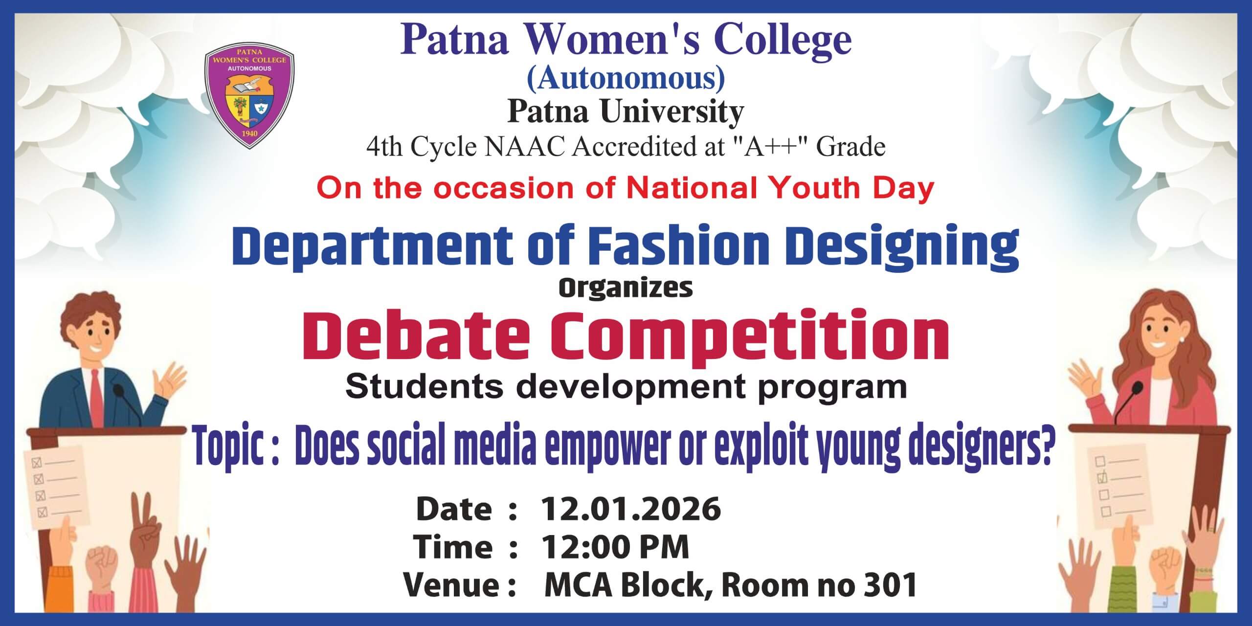 On the occasion of National Youth Day,12.01.26 the Department of Fashion Designing, Patna Women’s College organised a debate competition on the topic- “Does social media empower or exploit young designers?” The event aimed to encourage critical thinking among youth about growing influence of digital platforms on creative careers.The competition witnessed Read More…
