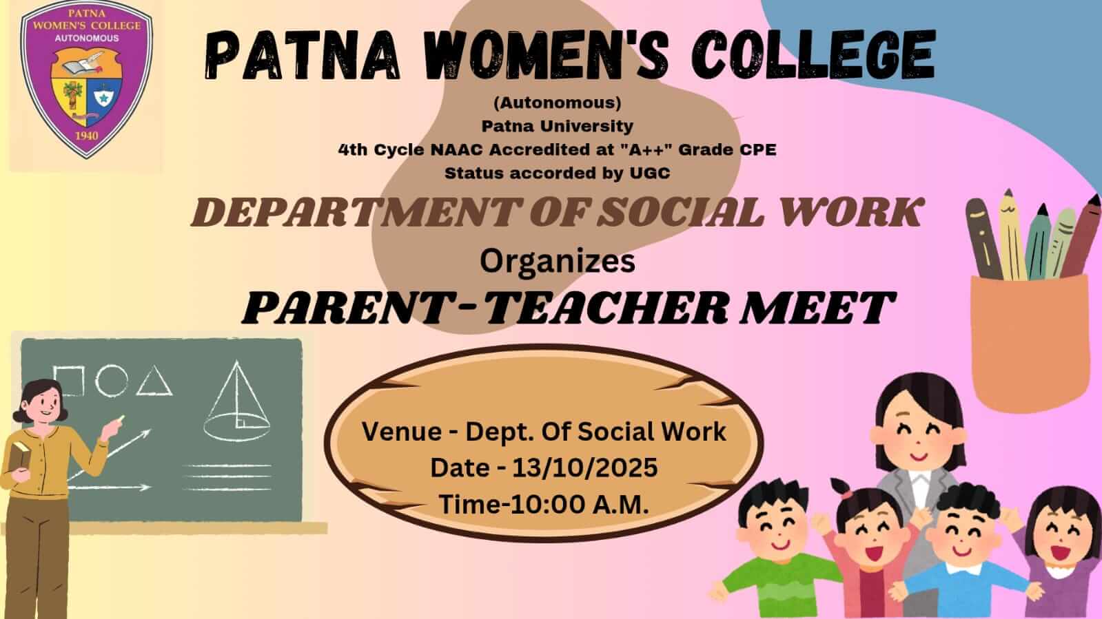 On 13th Oct 2025, The Department of Social Work, Patna Women’s College( Autonomous) Patna University conducted a Parent-Teacher Meet with the objective of fostering better communication and collaboration between parents and faculty. The meet provided a platform for discussing the academic progress, classroom behaviour, and overall development of students enrolled in the department. Dr. Mridul […]