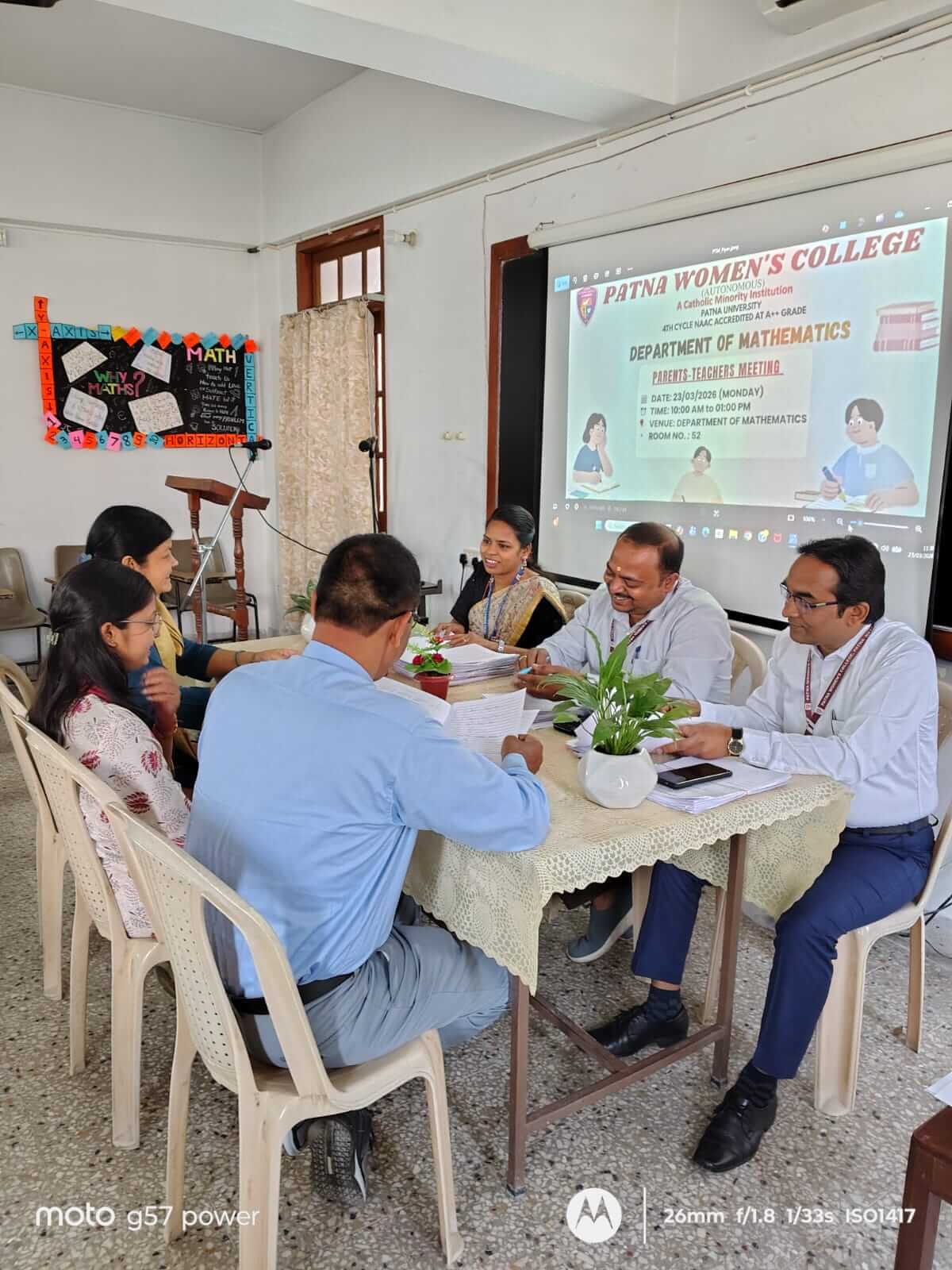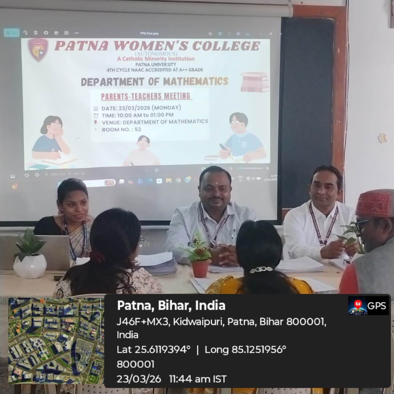 On 23.03.26 Department of Mathematics Patna women’s collage Autonomous Organised Parent Teachers Meeting 2026 for sem-II, Sem-IV and Sem-VI in room no 52.The meeting started with interactive session with parents which was addressed by Dr. Ravi kumar,Head of Department of Mathematics.The student’s reports were showed to the parents .The faculty members was Dr. Julee Sahni and Dr. Abinash Kumar.