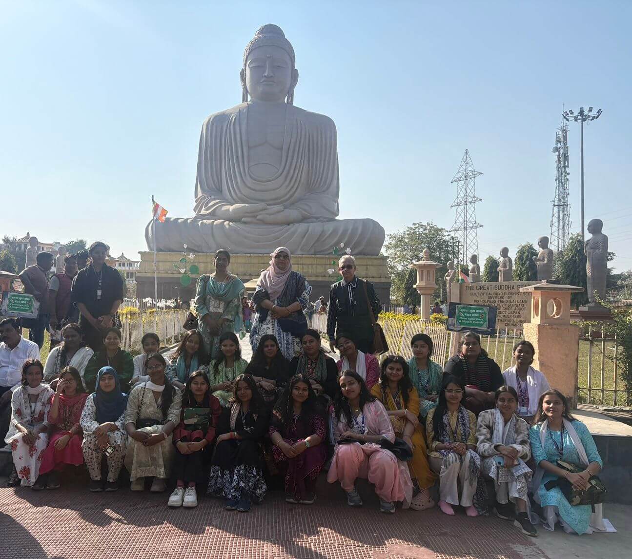 The first destination was the Mahabodhi Temple, a UNESCO World Heritage Site and a major Buddhist pilgrimage centre, where students were assigned on-site photography tasks and encouraged to experiment with composition, lighting, and visual storytelling. The second stop was the Daibutsu (Great Buddha Statue), one of the tallest Buddha statues in India. Students practised multiple photography techniques using both cameras and mobile phones, making the excursion academically enriching and productive.