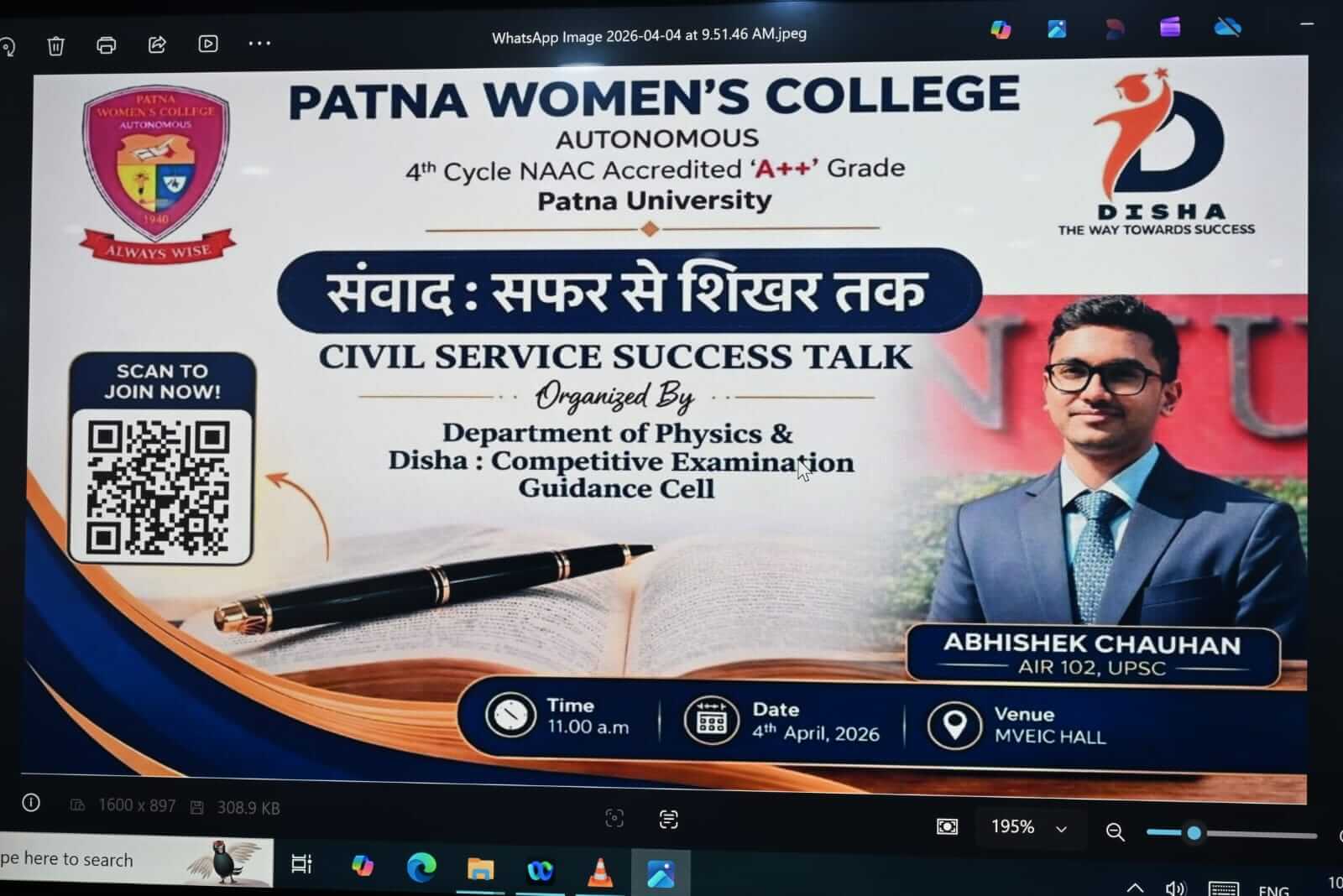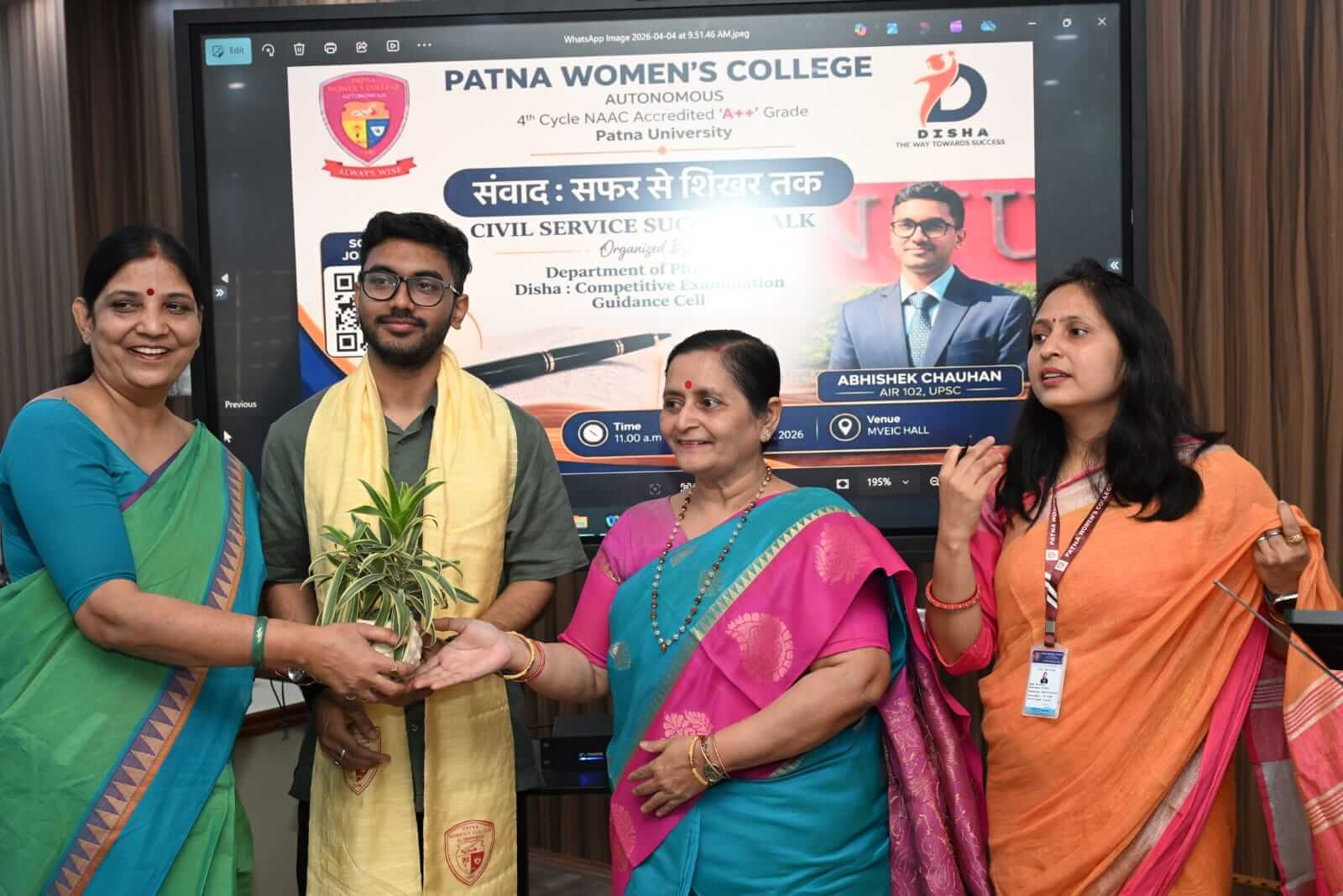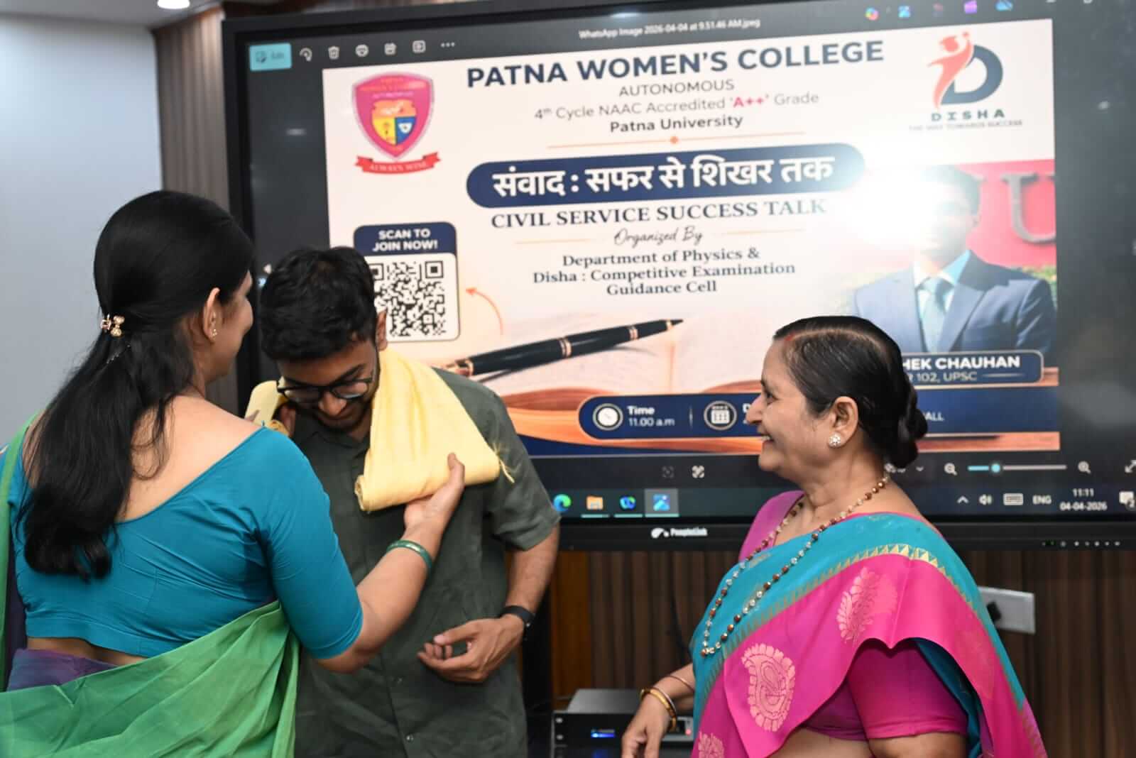 The Department of Physics and DISHA: Competitive Examination Guidance Cell, Patna Women’s College, Autonomous successfully hosted the संवाद: सफर से शिखर तक Civil Service Success Talk on 4th April 2026 at MVEIC Hall, leaving students inspired and motivated to pursue their dreams with renewed determination.