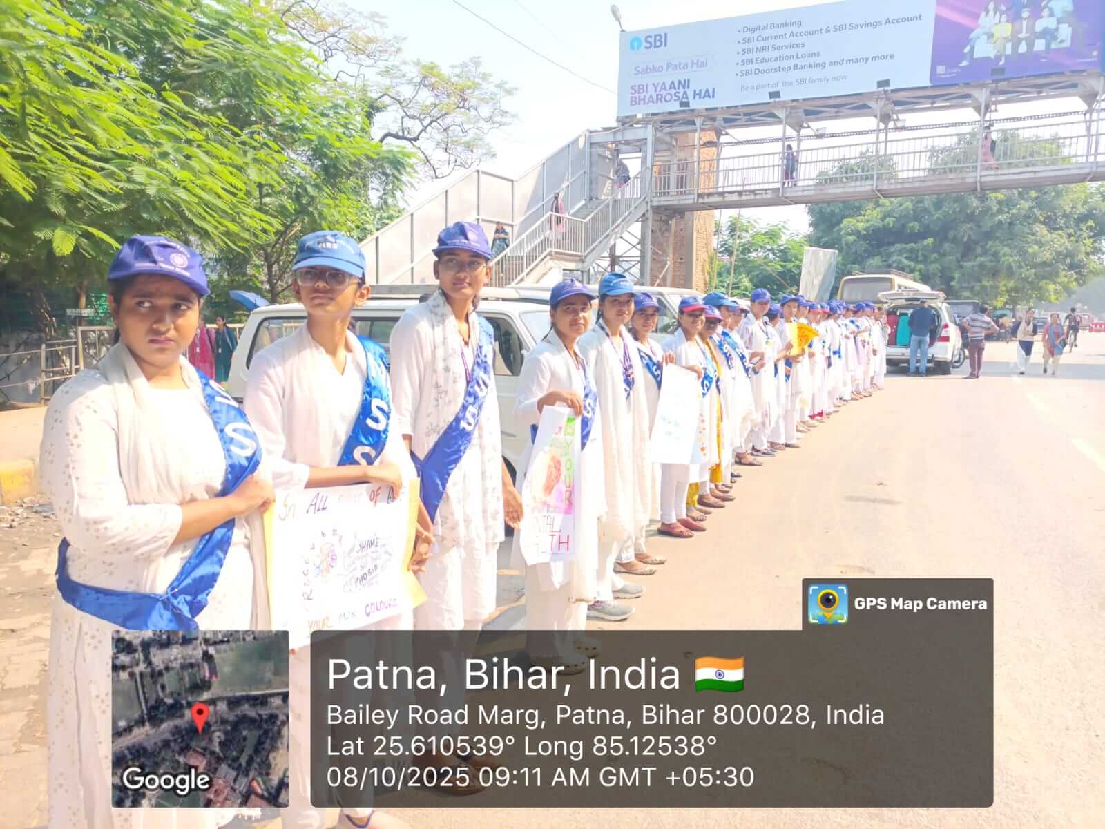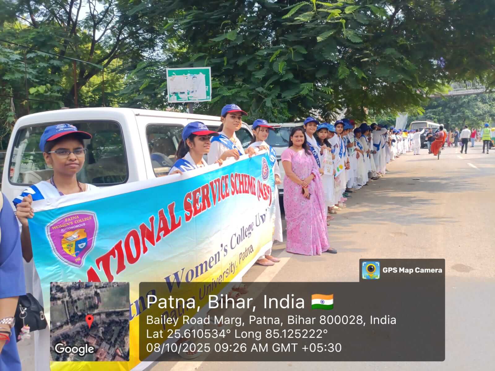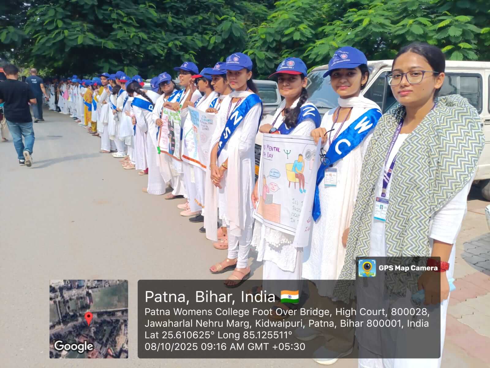 On the eve of World Mental Health Day, the NSS Unit, in collaboration with the Department of Psychology, Patna Women’s College, organized a Human Chain Formation outside the*college gate on 8/10/2025 to spread awareness about the importance of mental health and emotional well-being in today’s fast-paced world.