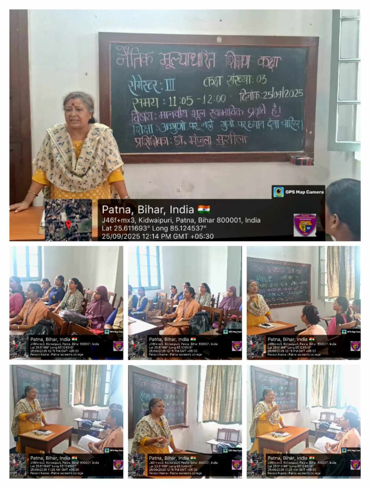 दिनांक 25/09/2025 को पटना वीमेंस कॉलेज के हिंदी विभाग द्वारा प्रथम, द्वितीय एवं तृतीय वर्ष की छात्राओं के लिए नैतिक मूल्य शिक्षण कक्षा आयोजित की गई जिसका मूल विषय था मानवीय भूल स्वाभाविक प्रवृत्ति है। वीडियो के माध्यम से छात्राओं ने समझा कि समाज में लोग हमारी अच्छाइयां भले ही नज़रंदाज़ करें परंतु एक गलती होने पर आलोचना करने में पीछे नहीं रहते। इस संसार में जितना आसान किसी की आलोचना करना है, उतना ही मुश्किल है किसी की प्रशंसा करना। वीडियो में एक कॉलेज का प्रसंग है जहां एक शिक्षक सभी प्रश्नों के उत्तर सही लिखते हैं परन्तु अंत में जानबूझ कर गलत उत्तर लिखते हैं जिसपर सभी विद्यार्थी उनकी गलती को तुरंत पकड़ लेते हैं। इस पर वो शिक्षक बताते हैं कि यद्यपि वे शिक्षक हैं परन्तु उससे भी पहले वे एक मनुष्य हैं और मनुष्य से गलतियाँ हो सकती हैं। अंत में वे छात्रों को तीन मुख्य बातें बताते हैं: यदि कोई गलती करे तो उसकी आलोचना न करें बल्कि उसे प्रेम से समझाएं, यदि कोई हमारी आलोचना करे तो अपने अंदर की अच्छाइयों को याद करें और सबसे महत्वपूर्ण बात, यदि कोई हमारी आलोचना करे तो उस पर ध्यान न देकर मेहनत कर एक सुखद भविष्य का निर्माण करें। प्रथम वर्ष की प्रशिक्षक डॉ दीपा श्रीवास्तव, द्वितीय वर्ष की प्रशिक्षक डॉ मंजुला सुशीला एवं तृतीय वर्ष की प्रशिक्षक डॉ सुषमा चौबे थीं।