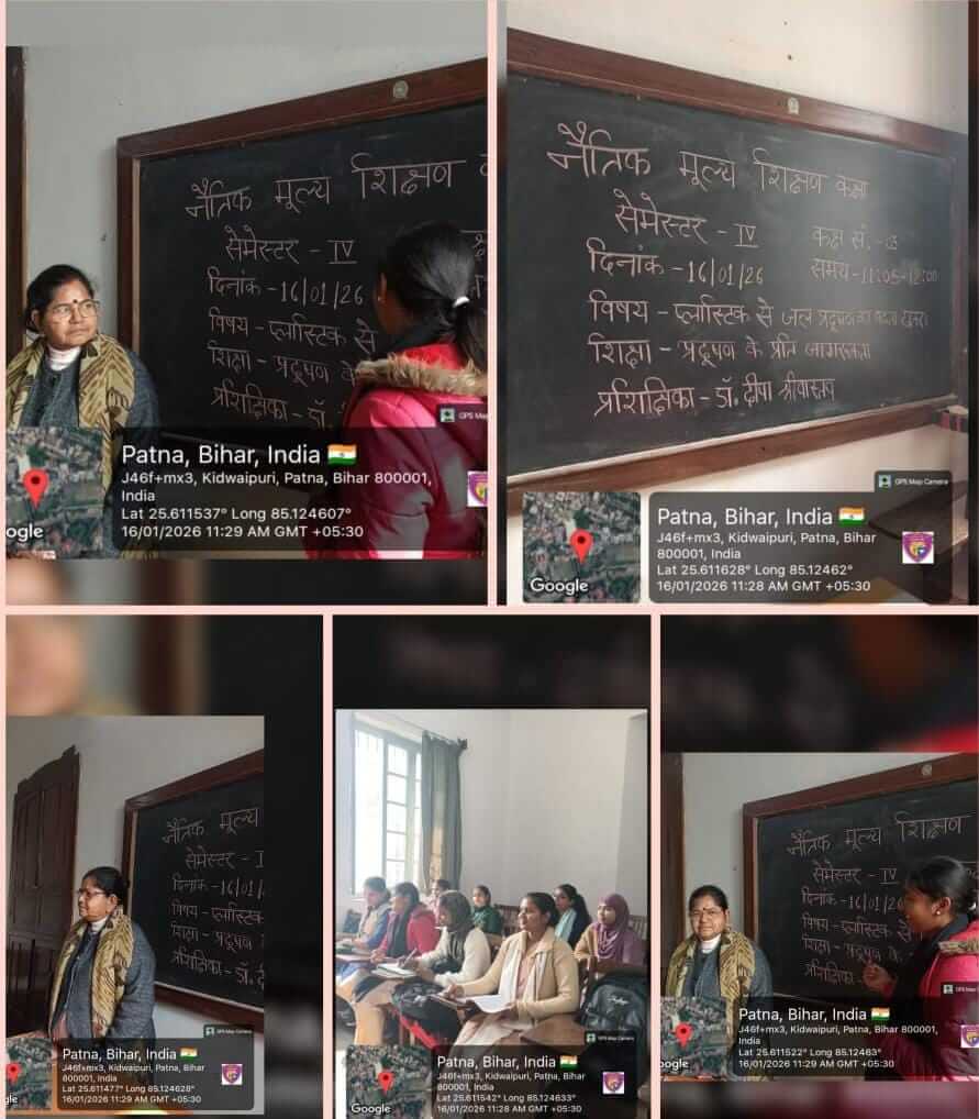 दिनांक 10 जनवरी, 2026 और 22 जनवरी,2026को हिंदी विभाग द्वारा प्रथम , द्वितीय एवं तृतीय वर्ष की छात्राओं के लिए नैतिक मूल्य शिक्षण कक्षा आयोजित की गई जिसका विषय था प्लास्टिक से दूरी, पर्यावरण के लिए है ज़रूरी। वीडियो के माध्यम से छात्राओं ने भारत में जल प्रदूषण की गंभीर समस्या को समझा तथा नदियों और समुद्र को प्रदूषण मुक्त करने के उपाय पर विचार किया। विश्व भर की 1000 सबसे प्रदूषित नदियों में से 144 भारत में हैं जिसका सबसे मुख्य कारण है प्लास्टिक। वीडियो में विभिन्न देशों के उदाहरणों द्वारा इस समस्या का समाधान भी बताया गया है। थाईलैंड, मलेशिया, वियतनाम जैसे विकासशील देश नदियों और समुद्र को स्वच्छ करने के लिए तकनीक की सहायता ले रहे हैं। इंटरसेप्टर नामक ओशियन क्लीनअप मशीन का प्रयोग प्लास्टिक के कचरे को इकट्ठा करने के लिए किया जा रहा है। छात्राओं ने समझा कि इस देश का नागरिक होने के नाते हमारा यह कर्त्तव्य बनता है कि हम अपनी नदियों एवं अन्य जल स्त्रोतों की केवल पूजा न करें बल्कि उनका सम्मान भी करें और उसे स्वच्छ रखने में अपनी भूमिका निभाएं। प्रथम वर्ष की प्रशिक्षक डॉ मंजुला सुशीला, द्वितीय वर्ष की प्रशिक्षक डॉ दीपा श्रीवास्तव तथा तृतीय वर्ष की प्रशिक्षक डॉ सुषमा चौबे थीं।