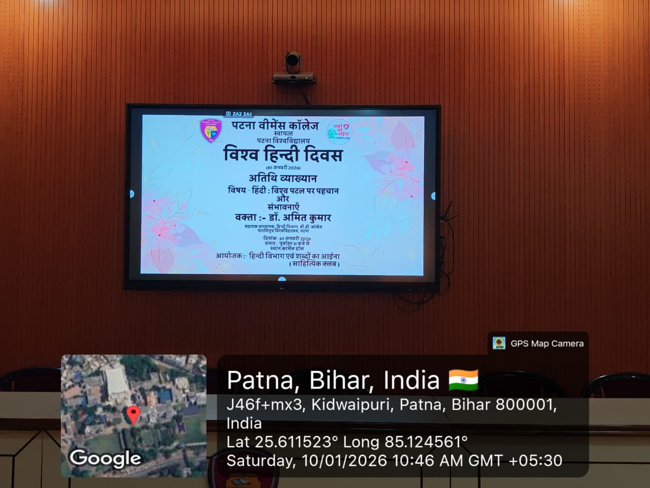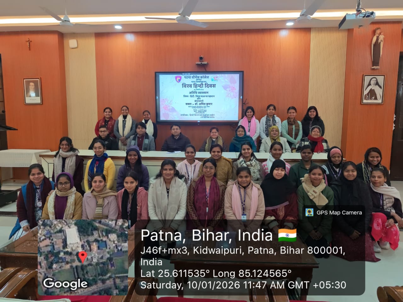 विश्व हिंदी दिवस के अवसर पर पटना वीमेंस कॉलेज के हिंदी विभाग एवं शब्दों का आईना साहित्यिक क्लब द्वारा हिंदी :विश्व पटल पर पहचान एवं संभावनाएं विषय पर अतिथि व्याख्यान का आयोजन किया गया। कार्यक्रम के अतिथि वक्ता बीडी कॉलेज, पाटलिपुत्र विश्वविद्यालय,पटना के हिंदी विभाग के सहायक प्राध्यापक डॉ. अमित कुमार थे। अपने वक्तव्य के माध्यम से डॉ अमित ने हिंदी के वैश्विक स्वरूप के साथ-साथ वर्तमान में उसकी उपयोगिता और भविष्य में हिंदी की संभावनाओं पर प्रकाश डाला। उन्होंने हिंदी के महत्त्व को रेखांकित करते हुए बताया कि आज हिंदी विश्व में तीसरी सबसे अधिक बोली जाने वाली भाषा है तथा दूसरी भाषा के शब्दों को आत्मसात करने की क्षमता ने हिंदी को लोकप्रियता प्रदान की है। वक्तव्य के उपरांत छात्राओं ने विषय से संबंधित प्रश्न भी किए। अतिथि का अभिवादन हिंदी विभाग के अध्यक्ष एवं शब्दों का आईना साहित्यिक क्लब के संयोजक डॉ कुमार धनंजय ने किया । कार्यक्रम का संचालन एवं धन्यवाद ज्ञापन हिंदी विभाग की तृतीय वर्ष की छात्रा शालिनी द्वारा किया गया। कार्यक्रम में हिंदी एवं उर्दू विभाग के प्राध्यापकगण तथा हिंदी विभाग की छात्राएं उपस्थित थीं।