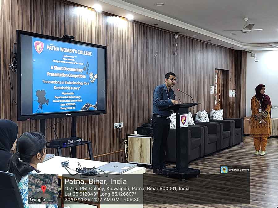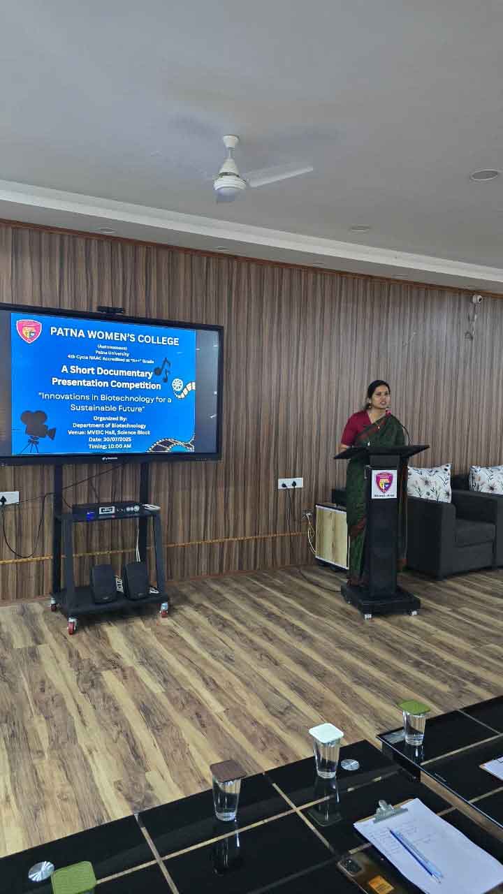 The Department of Biotechnology successfully organized a Short Documentary Presentation Competition as part of its academic enrichment activities, under the theme: “Innovations in Biotechnology for a Sustainable Future” at MVEIC Hall on 30 july, 2025 at 10:00 am. The event was organised under the leadership of Dr. Arti Kumari, Head of the Department of Biotechnology, Patna Women’s College and the event was supervised by Dr. Vivek Raj, Assistant Professor,Department of Biotechnology, Patna Women’s College .Valuable insights and guidance to the students were given by Dr. Alok Ranjan, Assistant Professor, Patna Women’s College and Dr. Premlata Kumari Assistant Professor, Patna Women’s College .