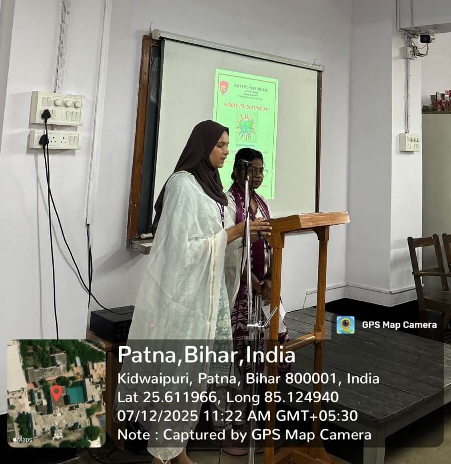 On 12th July 2025 the Department of Sociology in collaboration with Department of Psychology, Patna Women’s College ( Autonomous), Patna University organised speech competition on the topic ” Exploring Gender Population Dynamics” on the occasion of World Population Day for semester 5 students. A total of 24 students participated from both the departments giving an impactful speech and creating awareness among the audience. Speeches were delivered both in Hindi and English. The speeches were evaluated by a panel of esteemed judges – Dr. Tapashi Bhattacharjee Head department of Sociology, Dr. Nupur Sinha Head Department of Psychology and Dr. Mridula Mishra Head Department of social work. The judges were highly impressed and appreciated the confidence and vision displayed by the students. The first position was secured Saeeda Zainab (Department of Psychology) second position was secured by Soni (Department of Sociology) and third position was secured by Muskan from department of Sociology and also consolation prize was given to Komal Kumari and Alisha Verma from department of Sociology. Vote of thanks was proposed by Mantasha Rehman department of Sociology and Shikha Dhananjani department of Psychology.