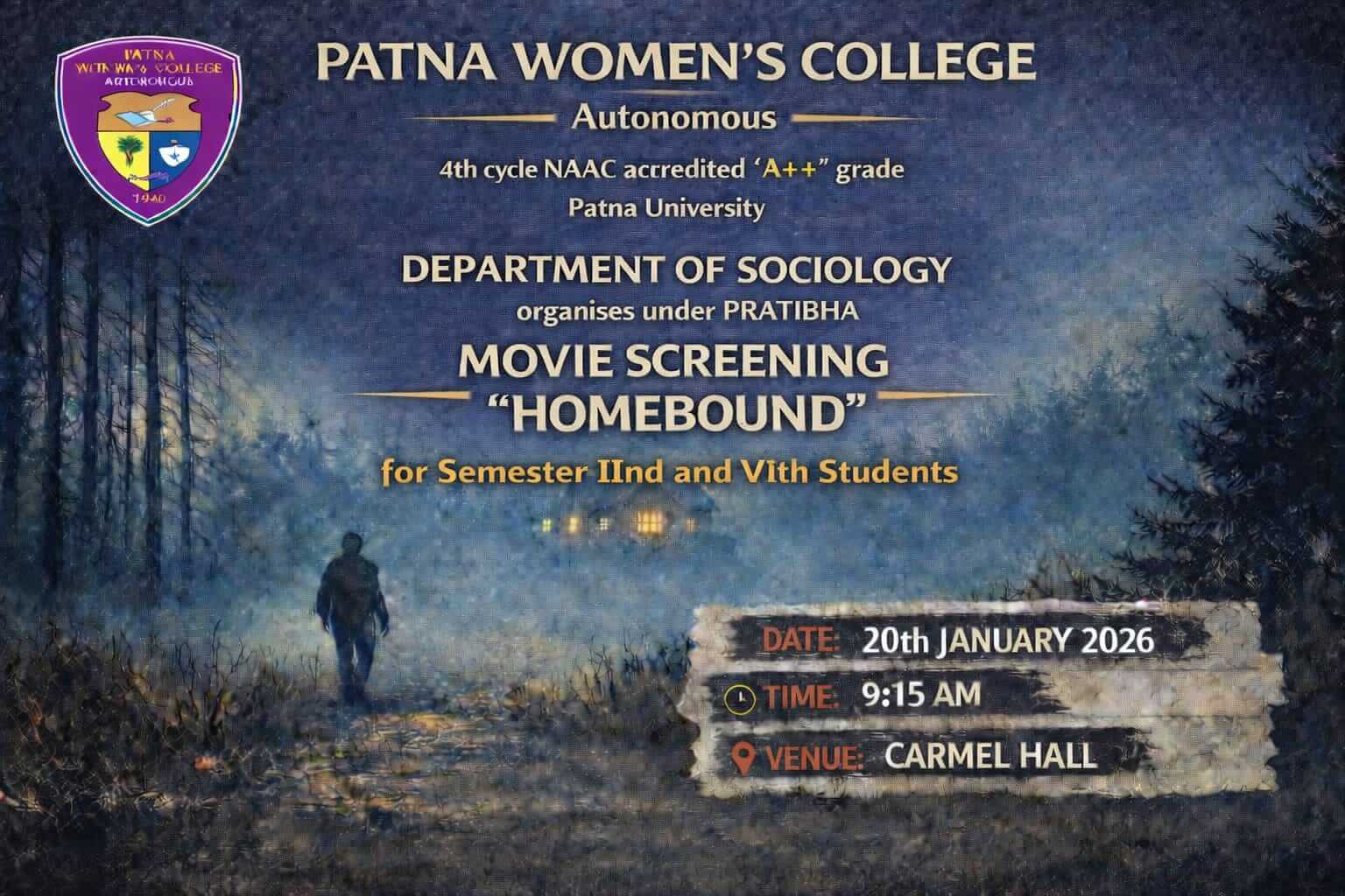 The Department of Sociology, Patna Women’s College (Autonomous), Patna University, successfully organised a Movie Screening of “Homebound” under PRATIBHA on 20th January 2026 at 9:15 AM in Carmel Hall. The programme was conducted for the students of Semester II and Semester VI with the objective of promoting learning through cinema and developing students’ understanding of social realities through visual narratives.