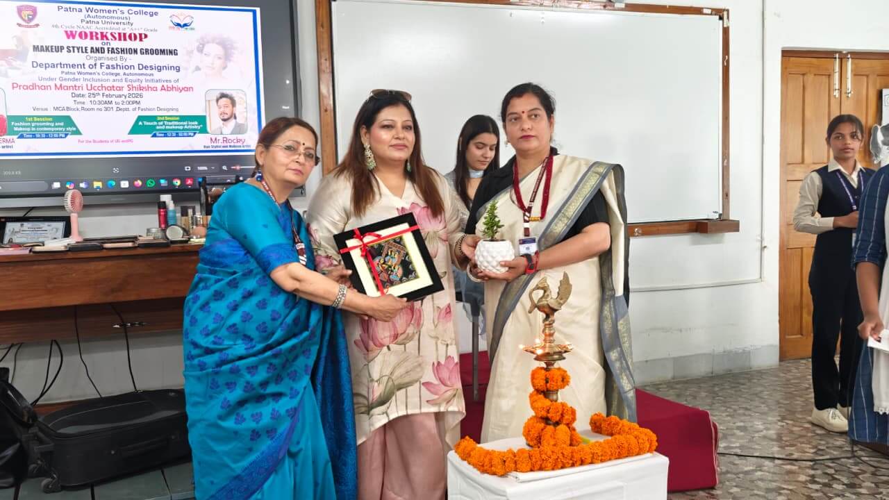 The Department of Fashion Designing, Patna Women’s College successfully organised a comprehensive workshop titled “Makeup Style and Fashion Grooming” under the initiative of “Pradhan Mantri Uchchatar Shiksha Abhiyan” (PM-USHA scheme) on 25th Feb, 2026. The workshop was conducted into two sessions. The first session was focused on contemporary style and the second was on traditional look. This workshop aimed to bridge the gap between academic learning and professional industry standards for Fashion Designing students.