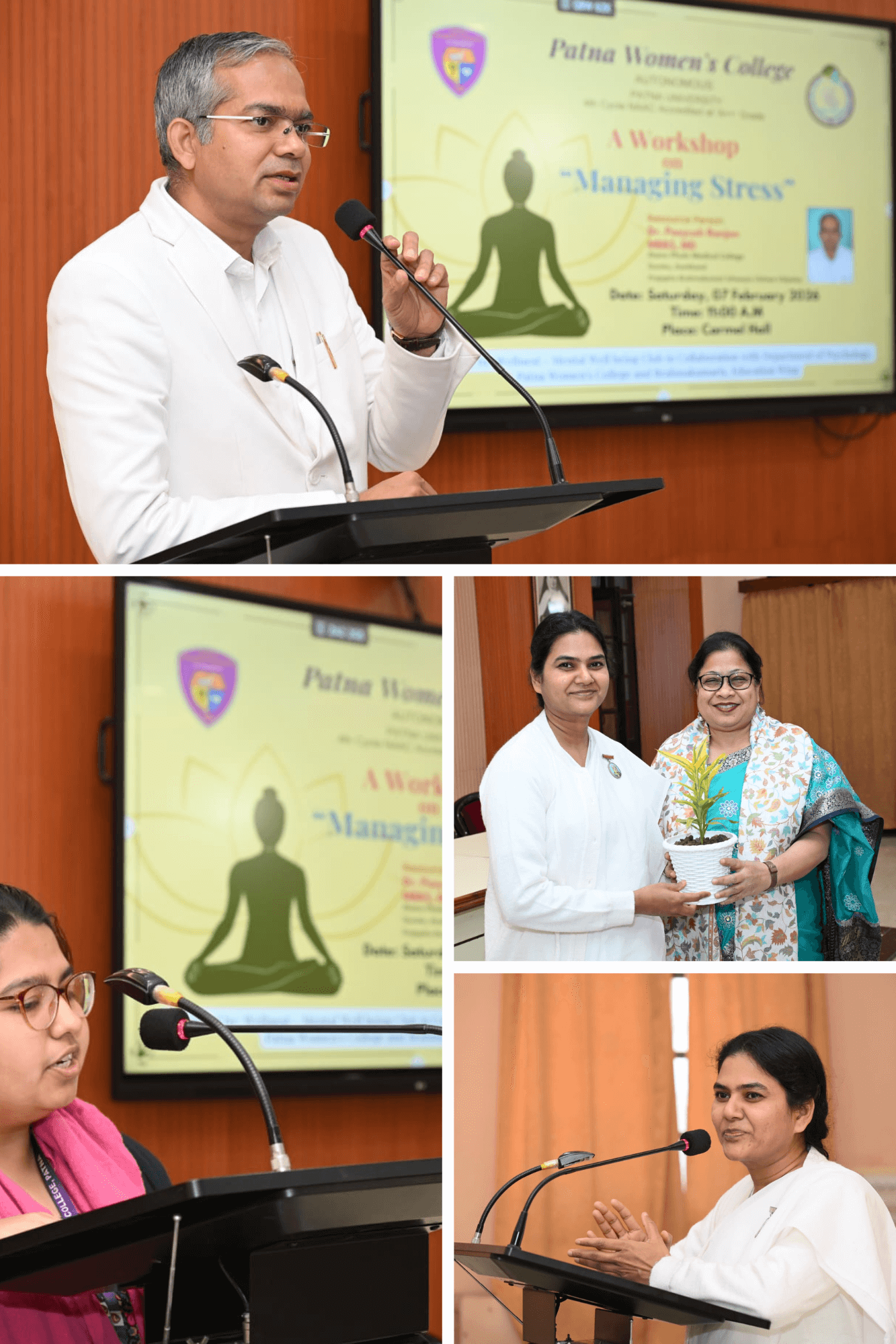 The programme started with Ish Vandana, and then welcoming the resource person, Dr. Peeyush Ranjan, MBBS, MD, Phulo Jhano Medical College, Dumka, Jharkhand and BK Sister Mridula with plant sapling. He told different techniques of managing stress, meditation and yoga as well. Almost 100 students of college have participated in this workshop. Sir gave practical sessions to easily recognise stress and manage it.