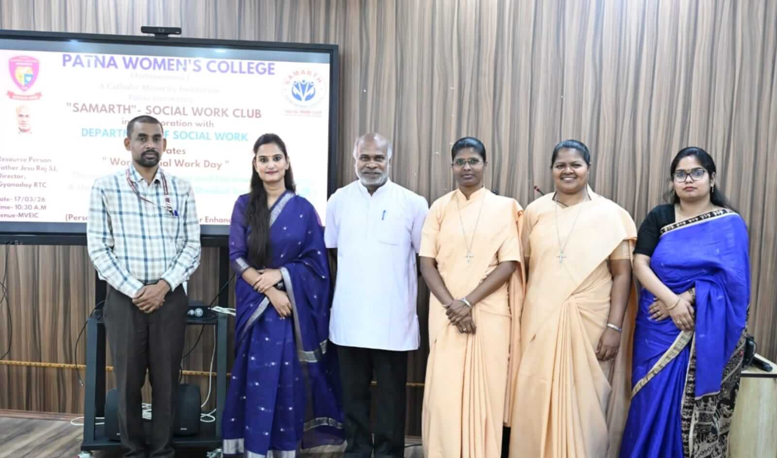 On 17th March 2026, the Social Work Club ‘SAMARTH’ in collaboration with Department of Social Work, Patna Women’s College (Autonomous), Patna University, celebrated “World Social Work Day” under the P.A.C.E (Personal Advancement and Career Enhancement) program with great enthusiasm. The programme commenced with the felicitation of the resource person Father Jesu Raj S.J. Director, Gyanoday RTC, Khaspur, Patna with a plant sapling by Dr. Mridul Mishra, Coordinator, Social Work Club ‘SAMARTH’ and Head, Department of Social Work as a gesture of respect and gratitude.